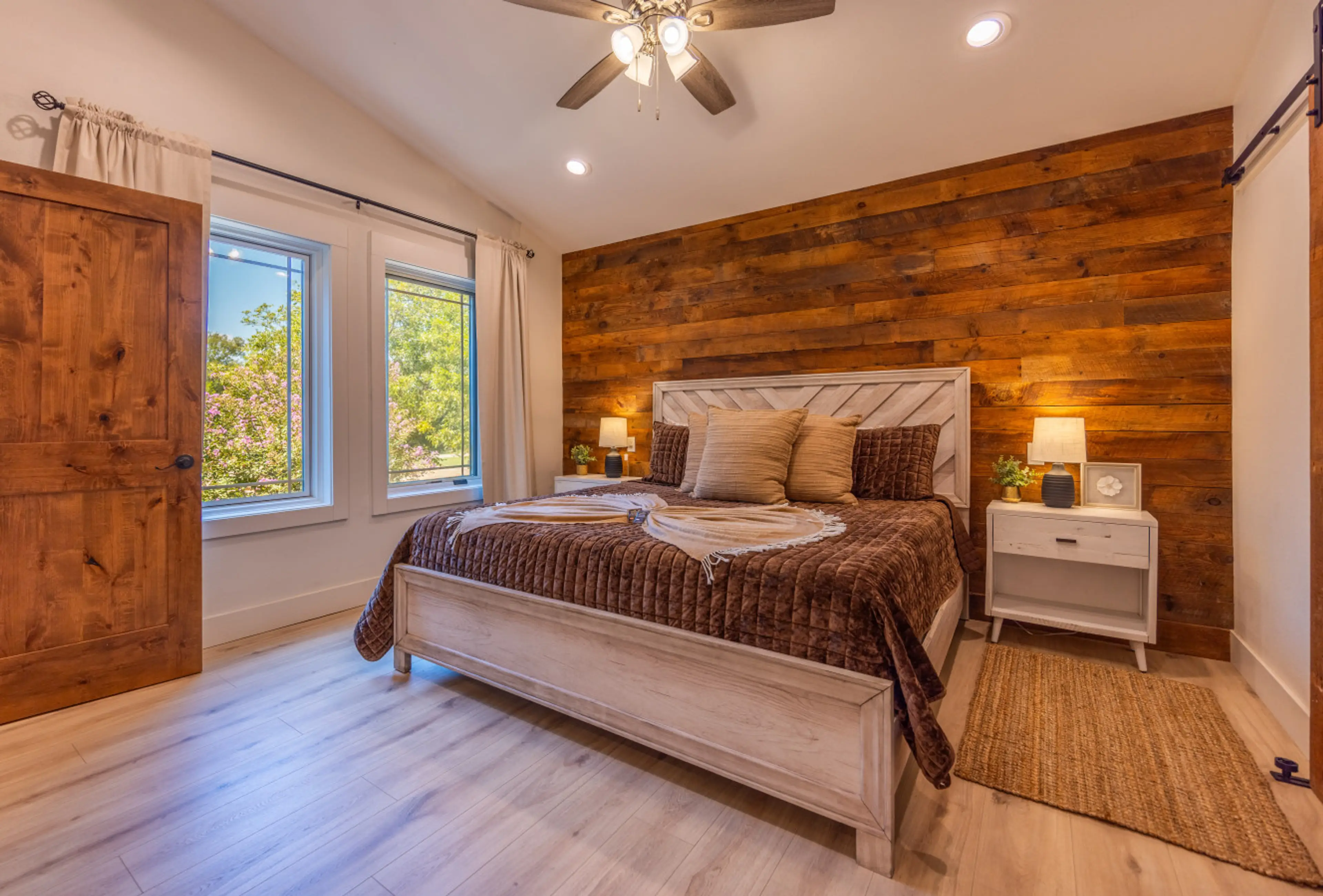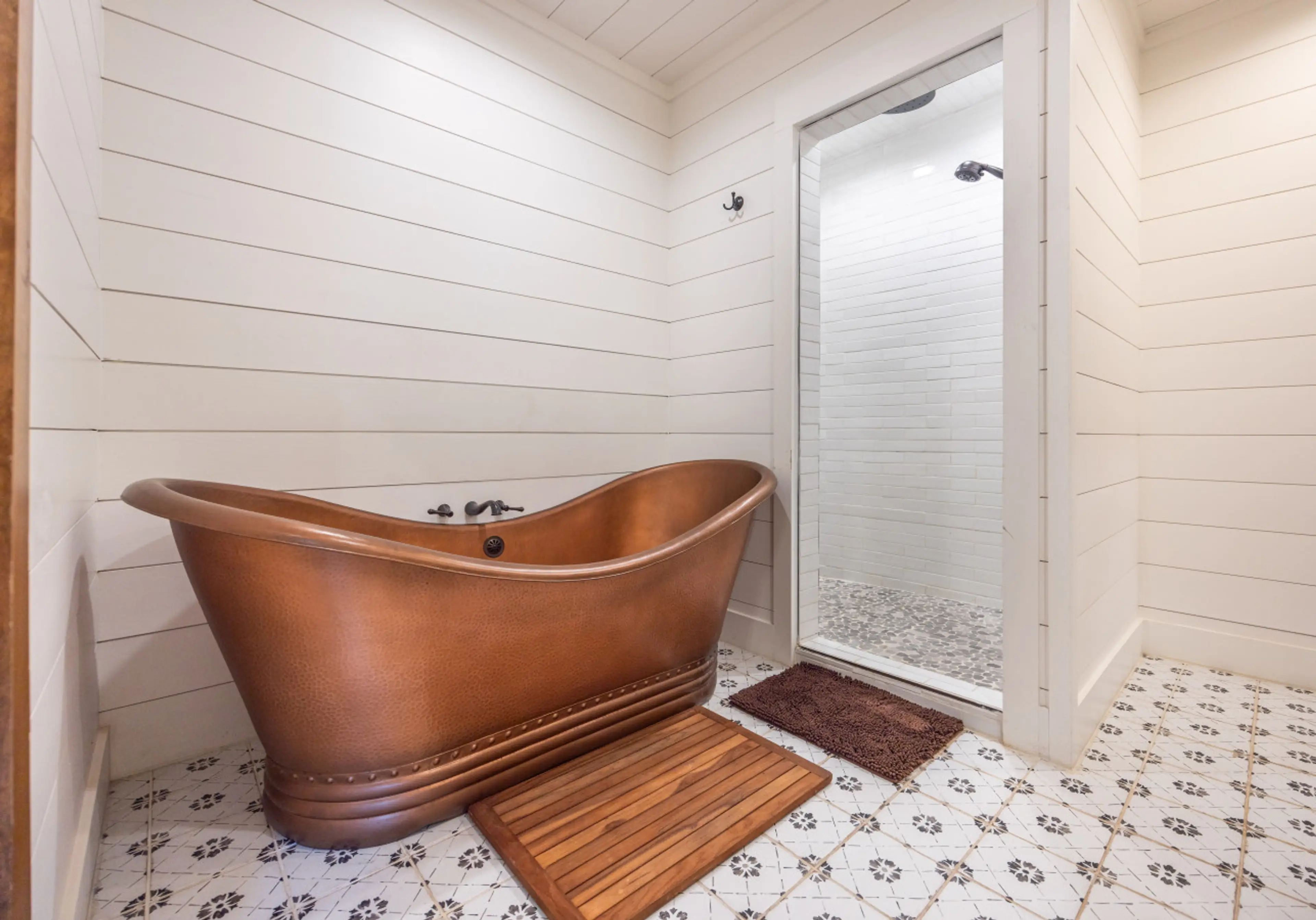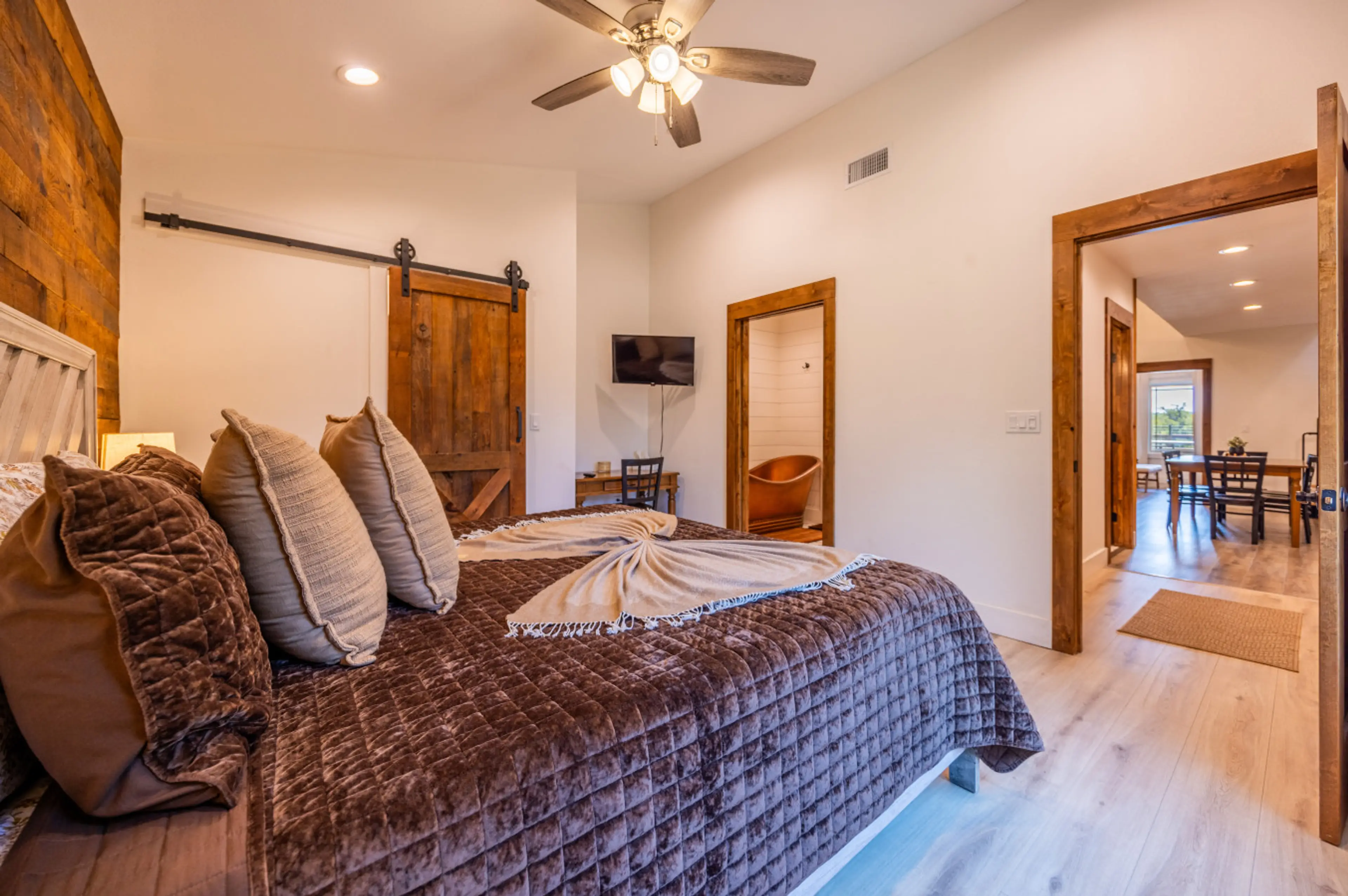 Welcome to the Cocoa Suite: your cozy retreat at our boutique hotel above our charming chocolate factory. This suite accommodates up to 6 guests, offering two king beds downstairs and a queen bed upstairs for a peaceful slumber. This suite features two master bathrooms and elegant copper tub and sin...